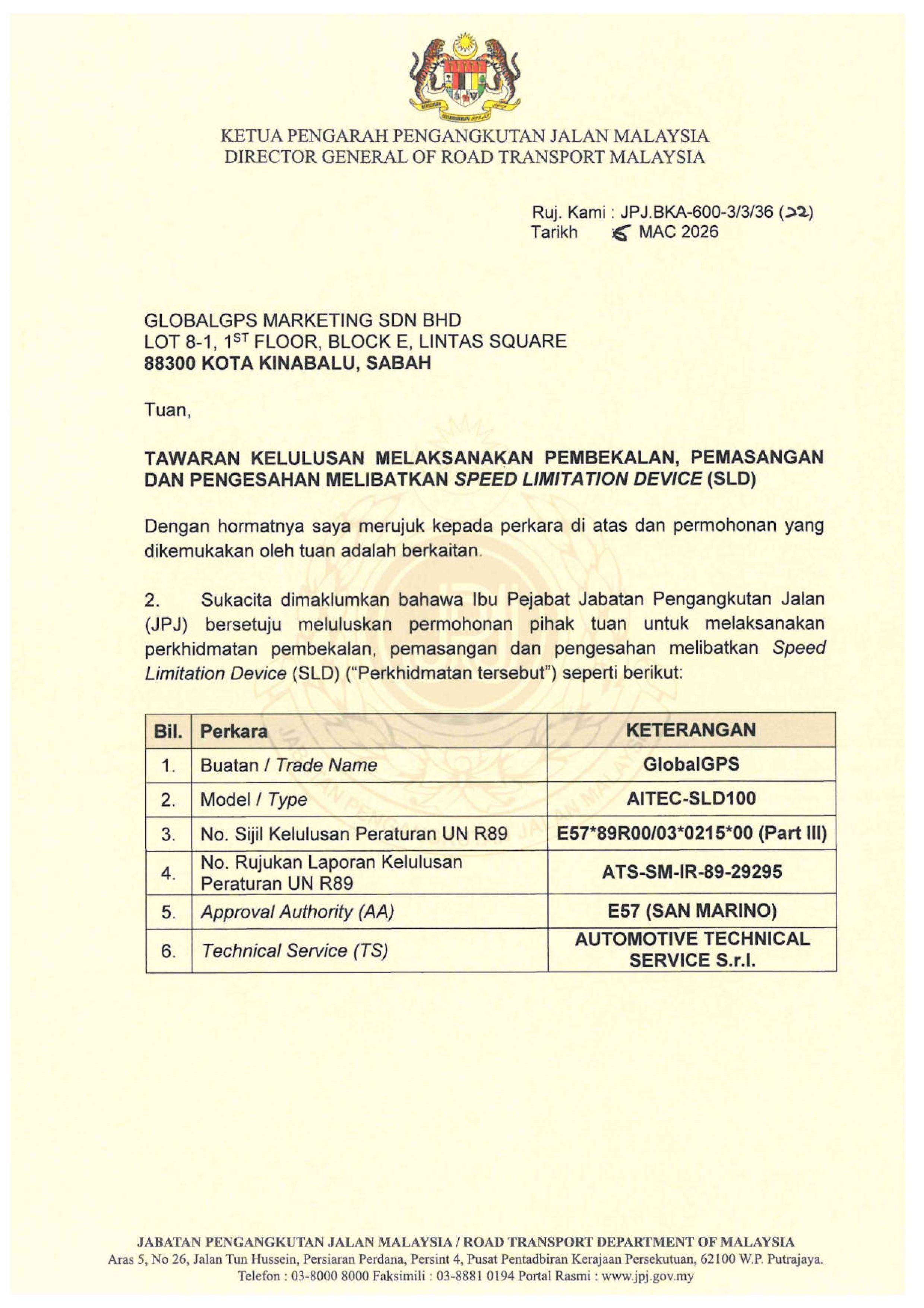 According to Jabatan Pengangkutan Jalan Malaysia (JPJ) enforcement policy, heavy goods vehicles above 3,500 kg and certain passenger vehicles must be equipped with a compliant Speed Limitation Device.
