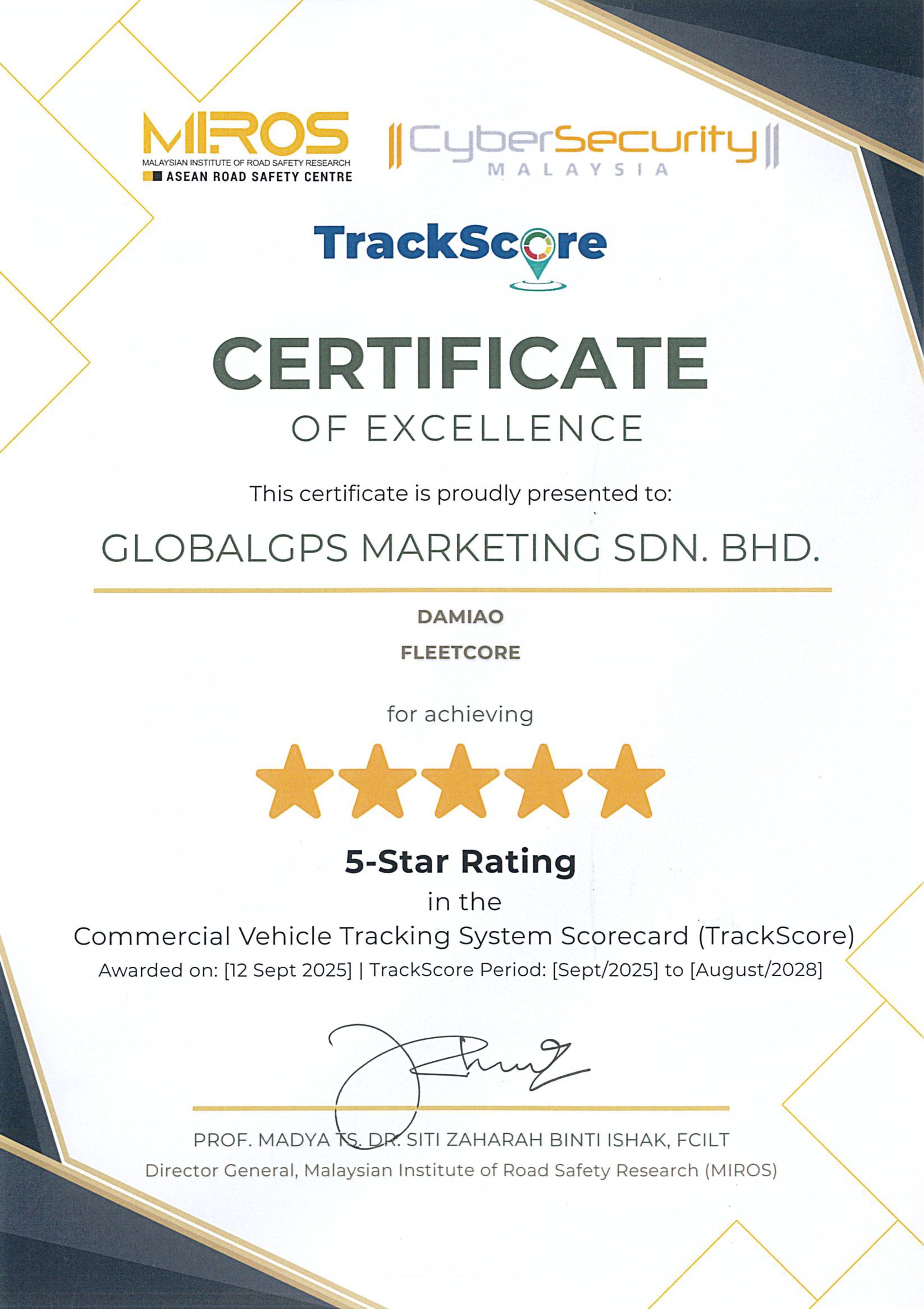 The Speed Limitation Device solution has been evaluated under the Malaysian road safety framework and awarded a 5-Star Rating by the Malaysian Institute of Road Safety Research (MIROS).